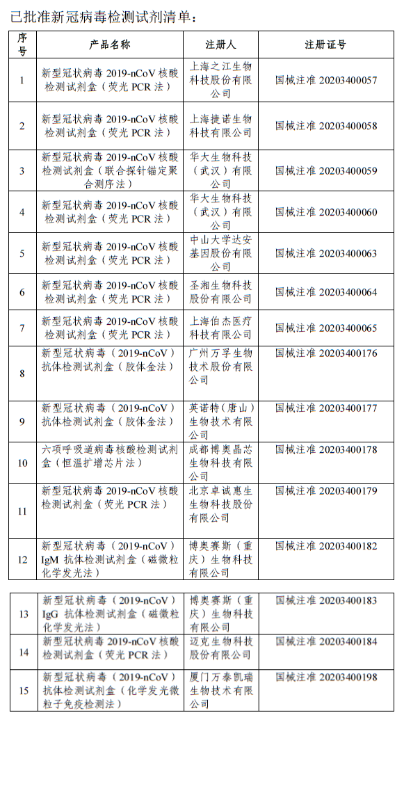 截至目前,国家药品监督管理局共批准新冠病毒核酸检测试剂10个,抗体检测试剂5个。