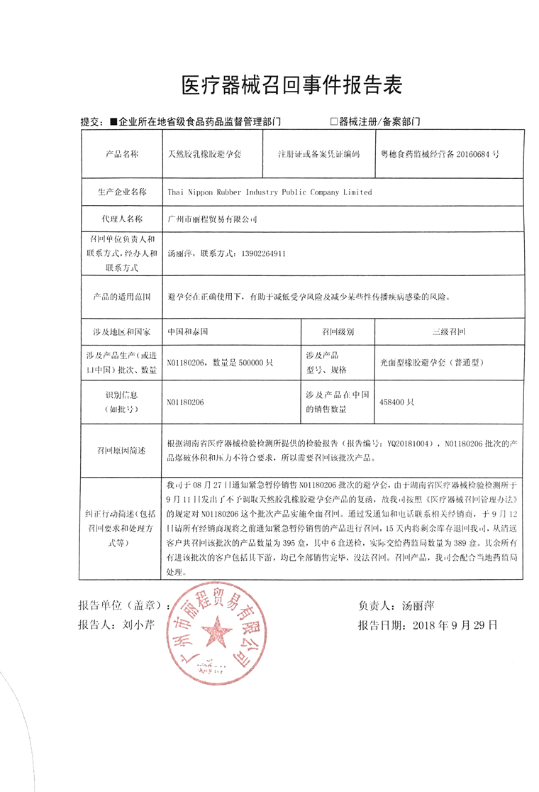 广州市丽程贸易有限公司报告,该公司代理的天然胶乳橡胶避孕套经检验,不符合标准规定。广州市丽程贸易有限公司主动召回有关产品,召回级别为三级。涉及产品的型号、规格及批次等详细信息见《医疗器械召回事件报告表》。