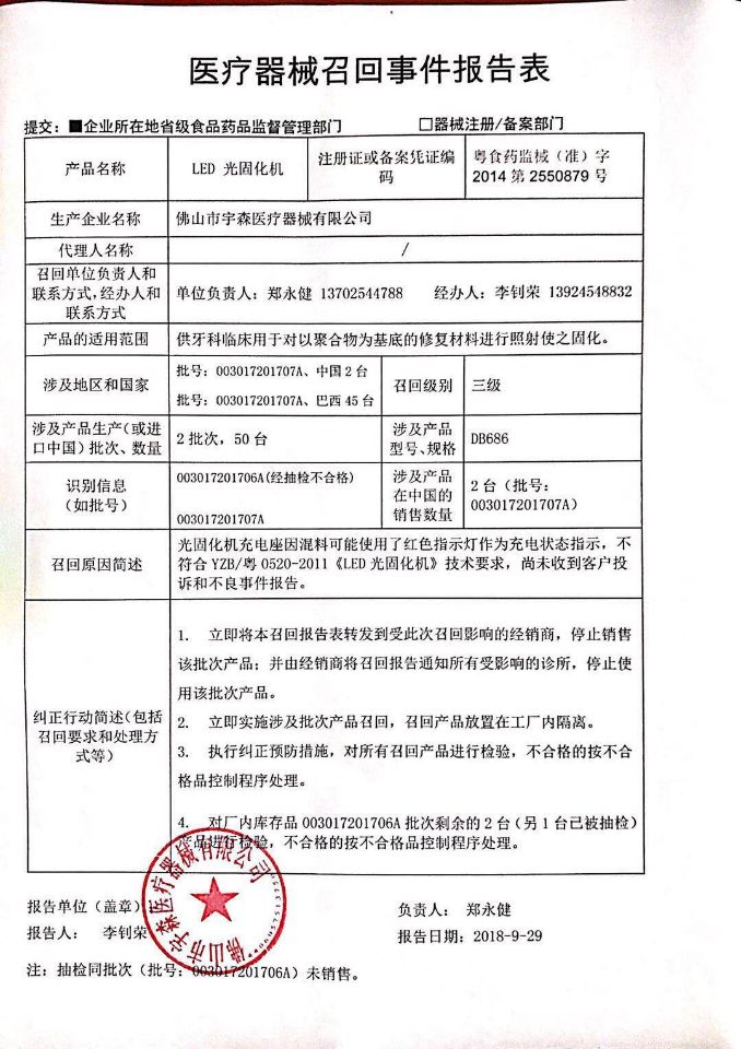 佛山市宇森医疗器械有限公司报告,该公司生产的LED光固化机经检验,不符合标准规定。佛山市宇森医疗器械有限公司主动召回有关产品,召回级别为三级。涉及产品的型号、规格及批次等详细信息见《医疗器械召回事件报告表》。