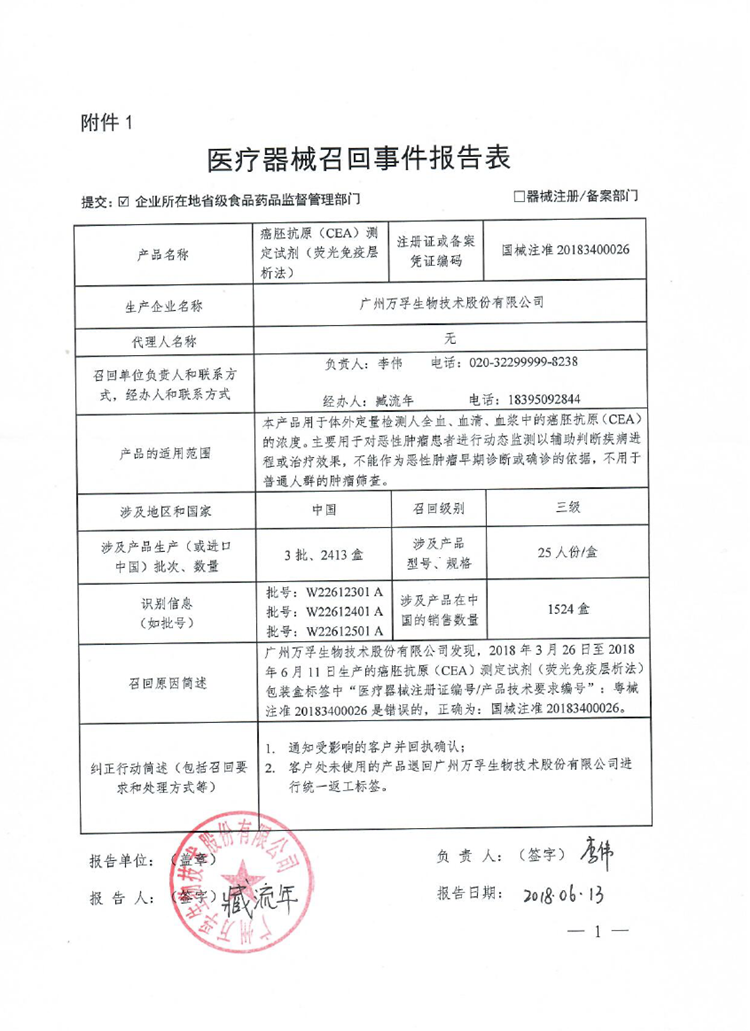 广州万孚生物技术股份有限公司报告,该公司生产的癌胚抗原(CEA)测定试剂(荧光免疫层析法)包装盒标签中医疗器械注册证编号/产品技术要求编号打印错误等原因,广州万孚生物技术股份有限公司主动召回有关产品,召回级别为三级。涉及产品的型号及批次等详细信息见《医疗器械召回事件报告表》。