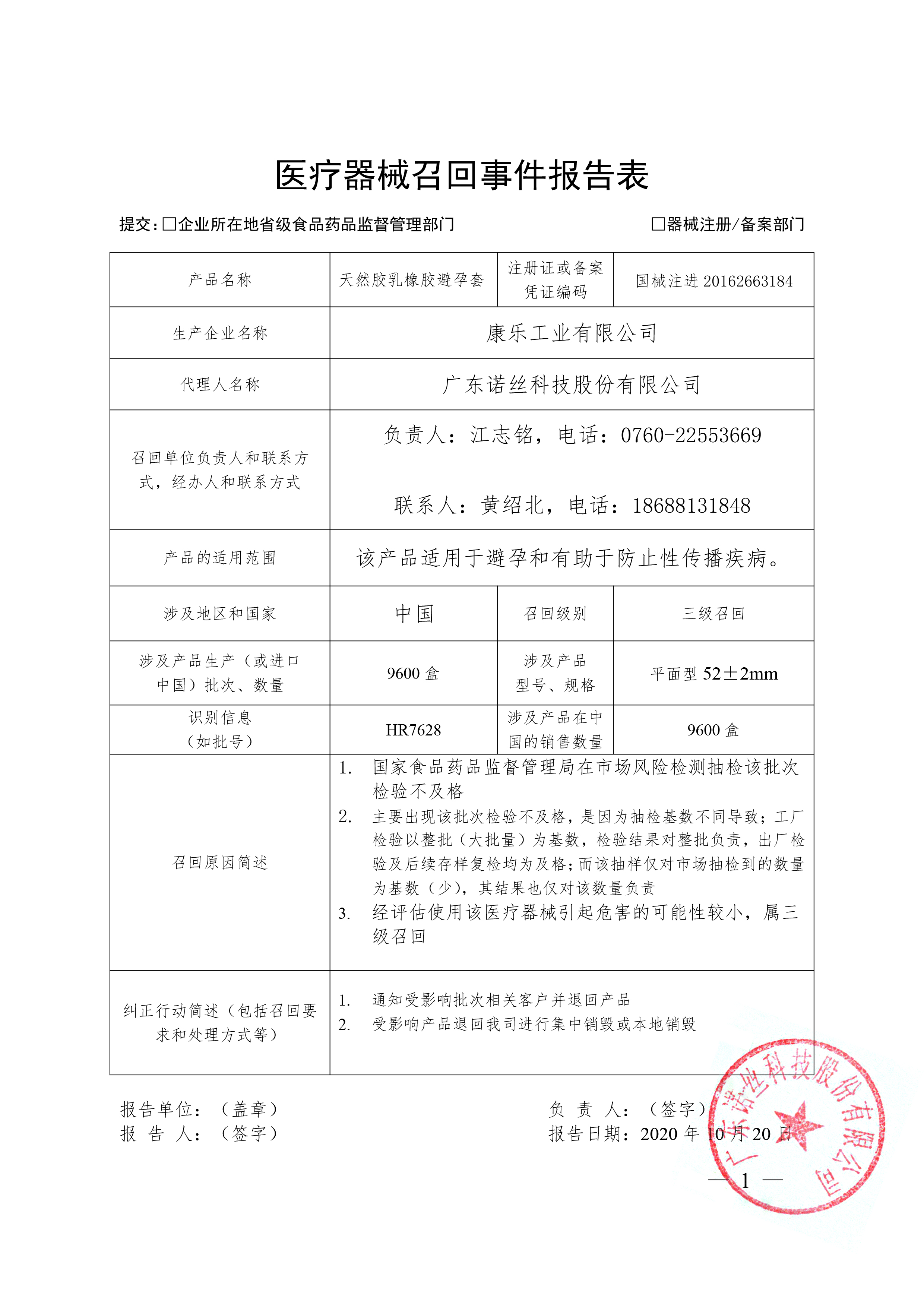 广东诺丝科技股份有限公司报告,该公司对其生产的天然乳胶橡胶避孕套实施主动召回处理,召回级别为三级,涉及产品的型号、规格及批次等详细信息见《医疗器械召回事件报告表》。