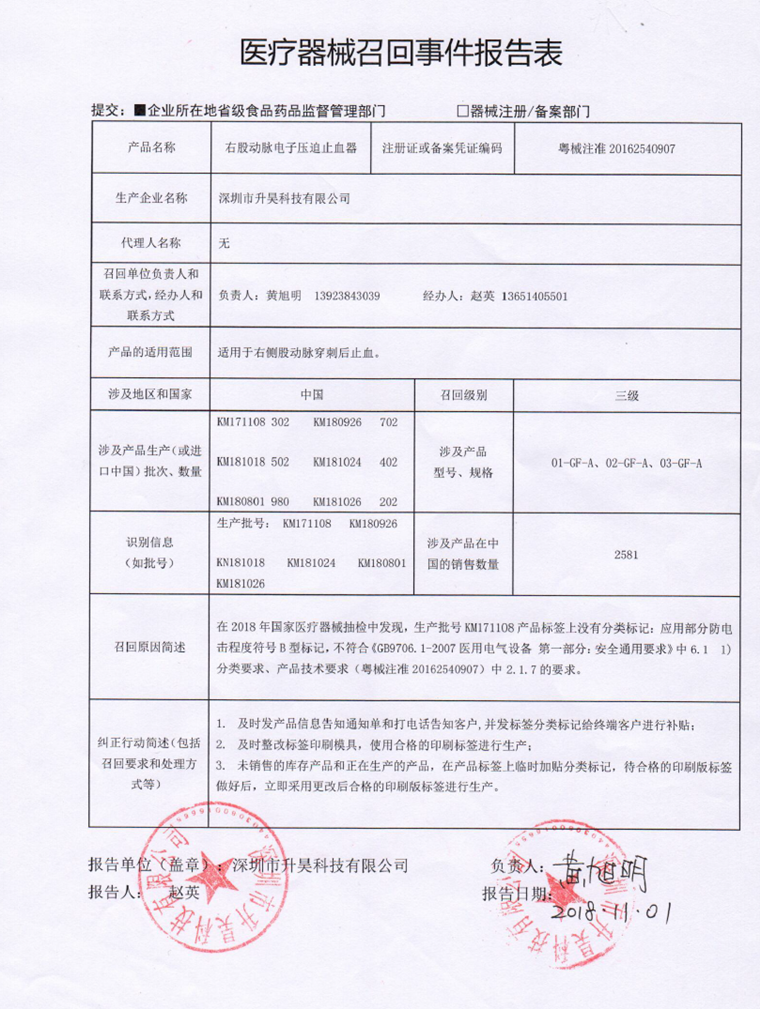 深圳市升昊科技有限公司对右股动脉电子压迫止血器主动召回