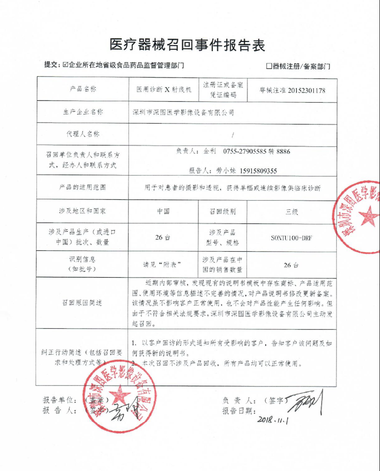 深圳市深图医学影像设备有限公司对医用诊断X射线机主动召回