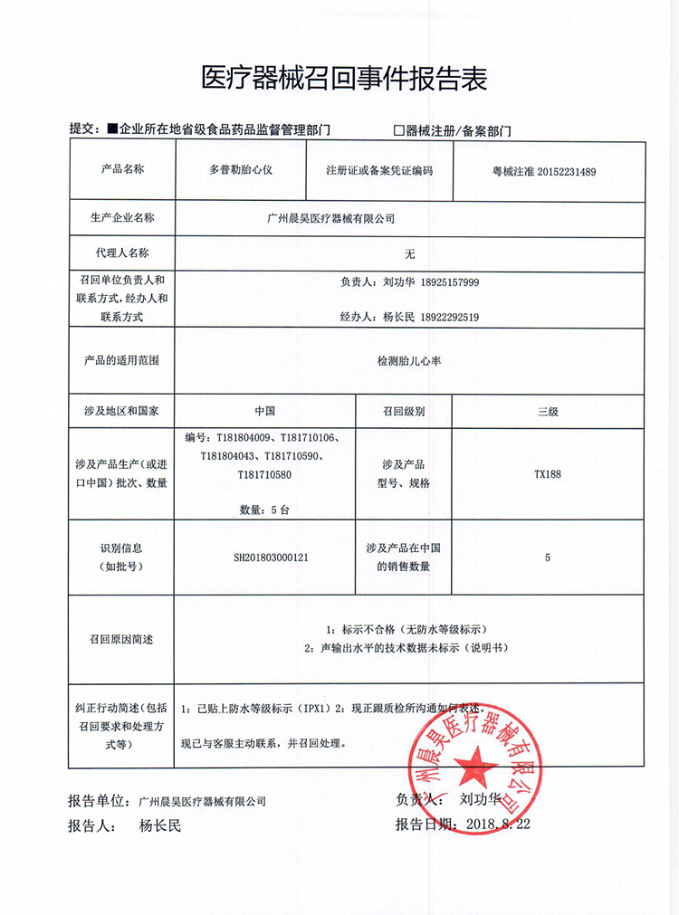 广州晨昊医疗器械有限公司对多普勒胎心仪主动召回