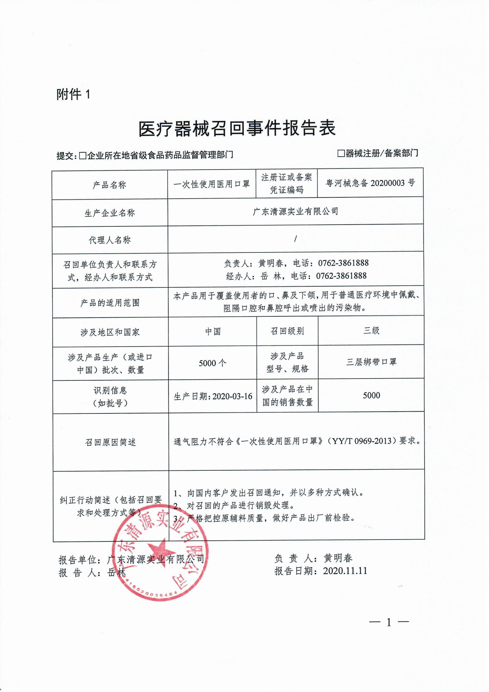 广东清源实业有限公司报告,该公司对其生产的一次性使用医用口罩实施主动召回处理,召回级别为三级,涉及产品的型号、规格及批次等详细信息见《医疗器械召回事件报告表》。