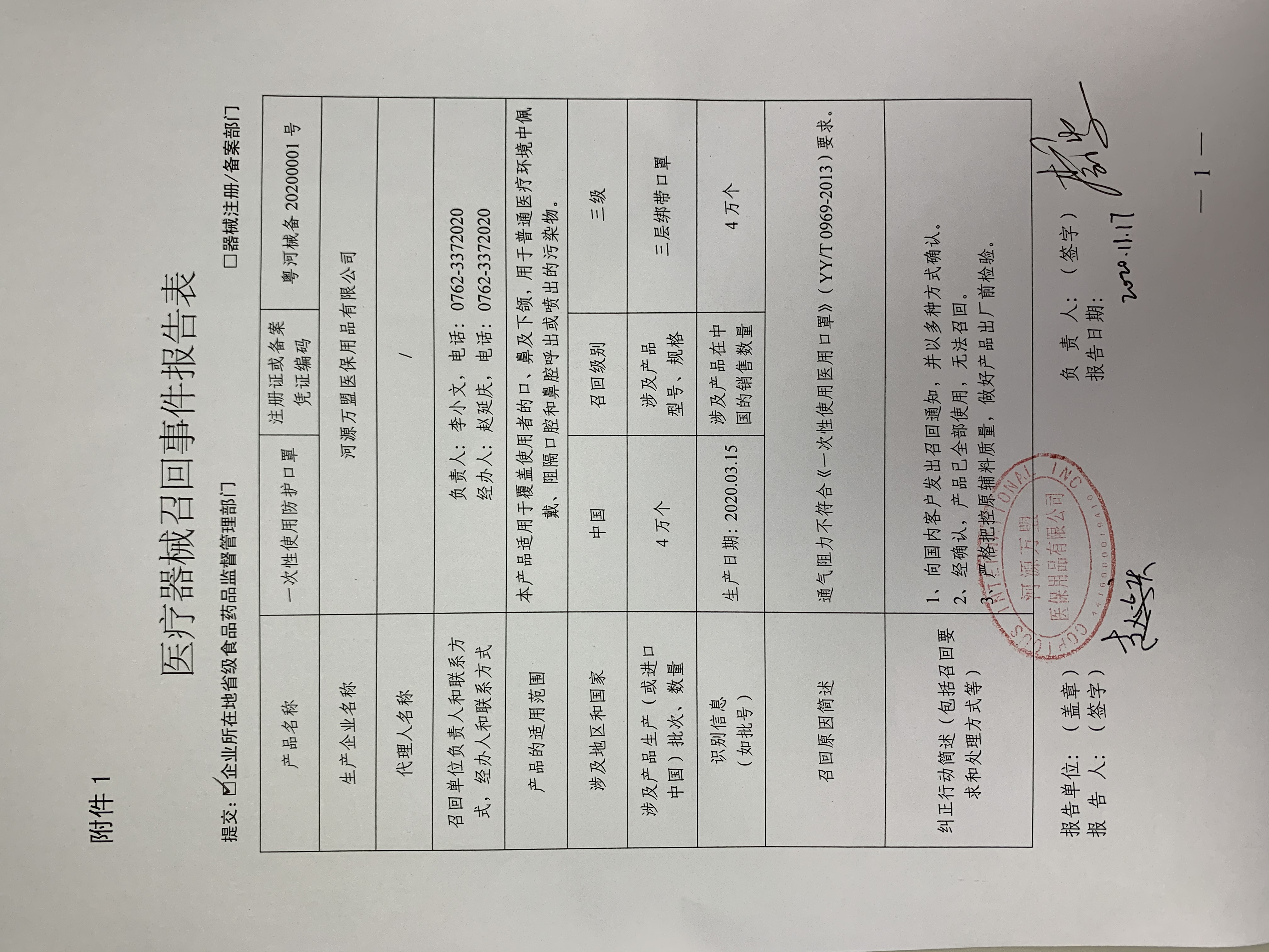 河源万盟医保用品有限公司报告,该公司对其生产的一次性使用防护口罩实施主动召回处理,召回级别为三级,涉及产品的型号、规格及批次等详细信息见《医疗器械召回事件报告表》。