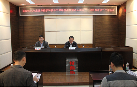 与会人员认真听取并评阅了省局领导班子的述职述廉报告和选人用人报告之后,对省局领导班子和领导干部进行了考核测评,对2016年度干部选拔任用工作进行了民主评议。