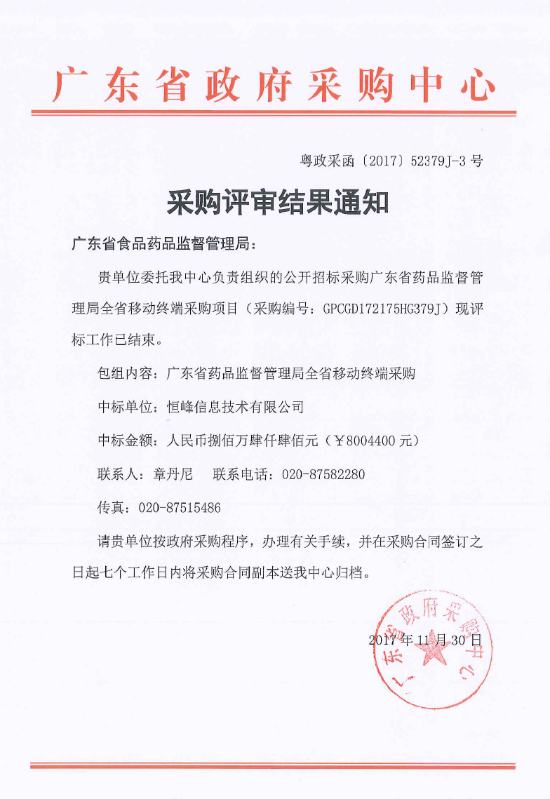 全省移动终端采购项目评审结果通知