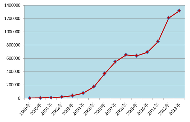 图1  1999-2013年全国药品不良反应/事件报告数量增长趋势