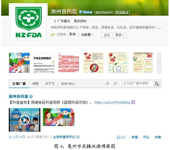 四是网络有视频。除了在惠州市局官网转播《保健品市场要“保健”》、《坑人的“保健品”》等央视关于保健食品的系列消费警示外,借省局发布《蓝帽子话你知》视频短片的契机,将其通过惠州市局腾讯微博、新浪微博以及主流视频网站如优酷土豆、腾讯视频等广泛传播,短短几天点击量已超13000次,仅腾讯官方微博的观看次数就超过了8000次,收到了出乎意料的效果。