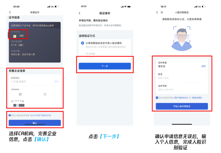 选择CA机构,完善企业信息,完成人脸识别验证。