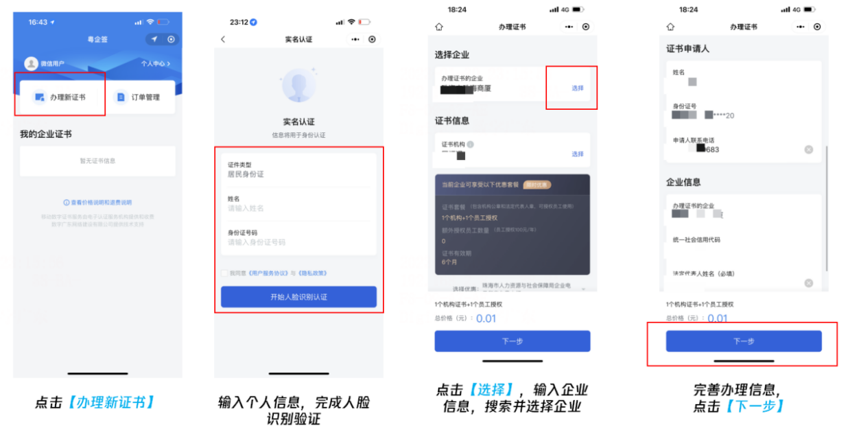 在粤企签小程序办理证书(印章),办理人可通过“法定代表人人脸识别验证”或“对公银行账号转账验证”完成企业认证。