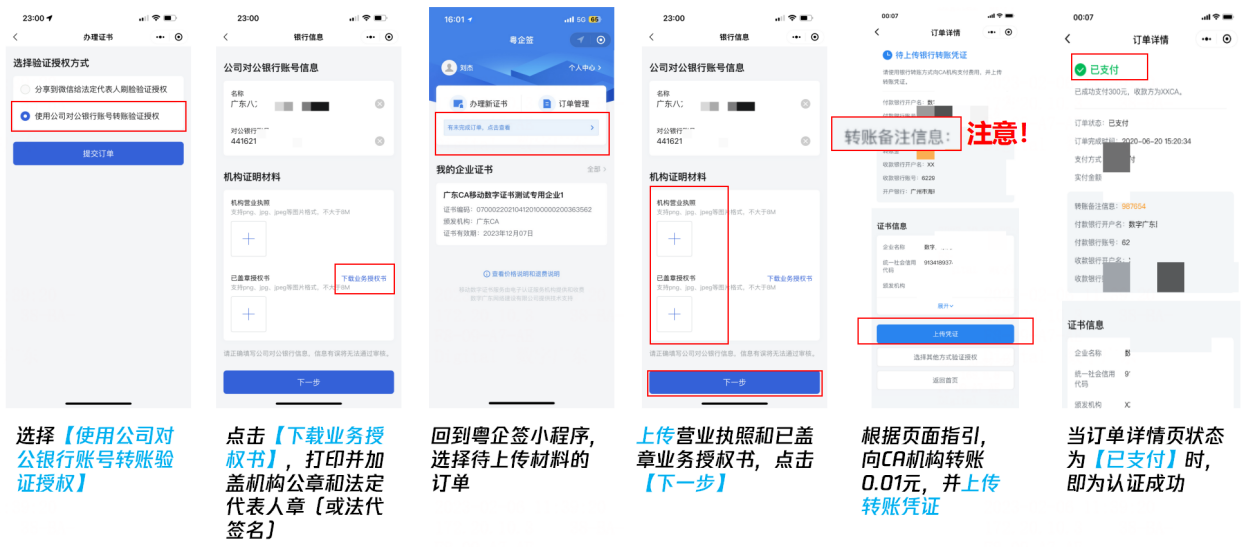下载业务授权书须加盖机构公章、法定代表人章(或由法代签名)及填写申请日期,在系统内上传营业执照和已盖章的业务授权书。使用对公银行账号向CA机构转账0.01元并上传转账凭证,CA机构审核通过后即可完成验证。*注意:向CA机构转账时,务必将系统内“转账备注信息”中的信息作为转账备注。