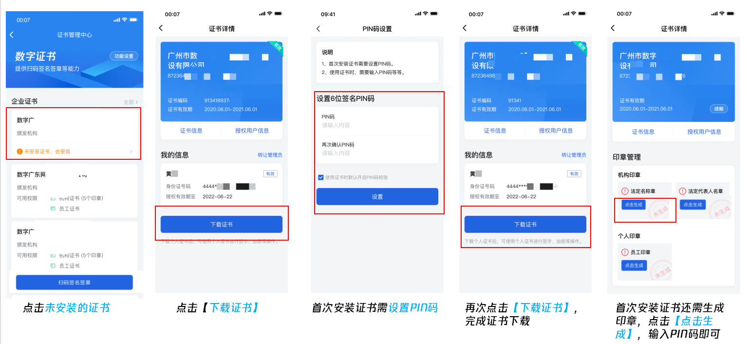 2.在粤商通APP安装数字证书,设置PIN码时,6位数字需谨记,如果忘记,可在粤商通APP-我的-电子印章-功能设置-PIN码设置处重置;