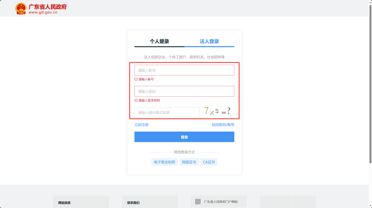 2、通过省统一的法人账号密码方式登录系统。(如果还没有账号密码请先点击【立即注册】,按照系统提示进行账号注册)