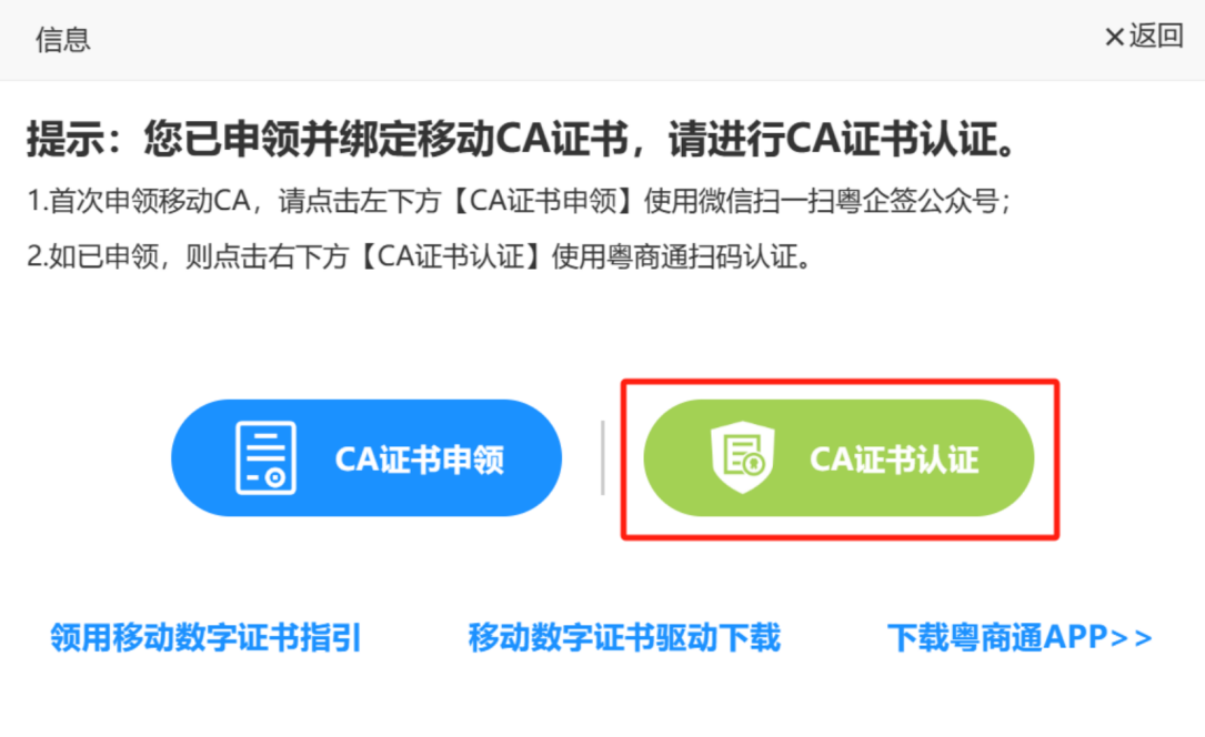 如已申领,则点击右下方【CA证书认证】使用粤商通扫码认证。