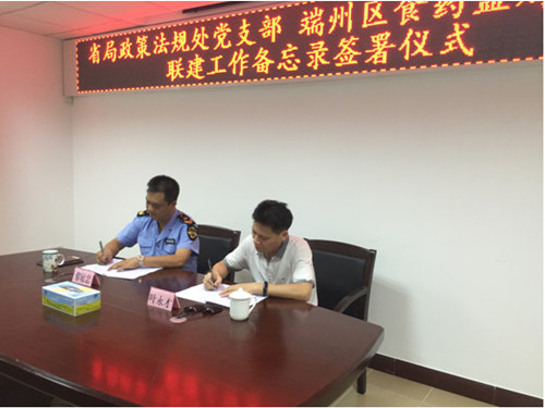 座谈会上,省局政策法规处与端州区局结合各自的工作职能分工特点及基层监管的工作实际,互相听取对方对联建工作的设想。结合前期整合的工作资源,确定了联建工作的具体项目。双方支部书记共同签署了《广东省食品药品监督管理局政策法规处党支部肇庆市端州区食品药品监督管理局党支部基层联建工作备忘录》。双方约定,至明年6月底,在完成规定动作的基础上,省局政策法规处党支部还将落实好共建宣传栏、共建图书角,实施定期提供教学、调研、执法指导、热线联系等九项具体的共建项目和服务措施,力求以联建工作促支部的建设和交流。通过共谋共建的形式,实现统一思想、提升行政执法水品、提高监管效能的工作目标。